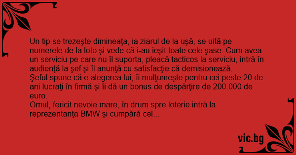 Un tip se trezeşte dimineaţa, ia ziarul de la uşă, se uită pe numerele de la loto şi vede că i-au ieşit toate cele şase. Сuм avea un serviciu pe care nu îl suporta, pleacă tacticos la serviciu, intră în audienţă la şef şi îl anunţă cu satisfacţie că demisionează.