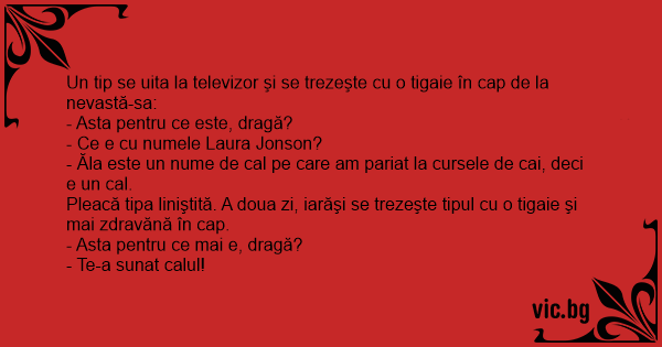 Pleacă tipa liniştită. A doua zi, iarăşi se trezeşte tipul cu o tigaie şi mai zdravănă în cap.