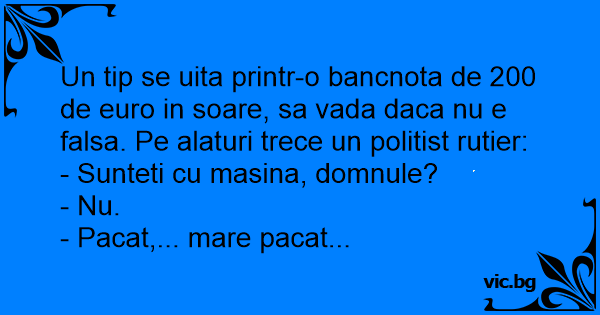 Un tip se uita printr-o bancnota de 200 de euro in soare, sa vada daca nu e falsa. Pe alaturi trece un politist rutier: