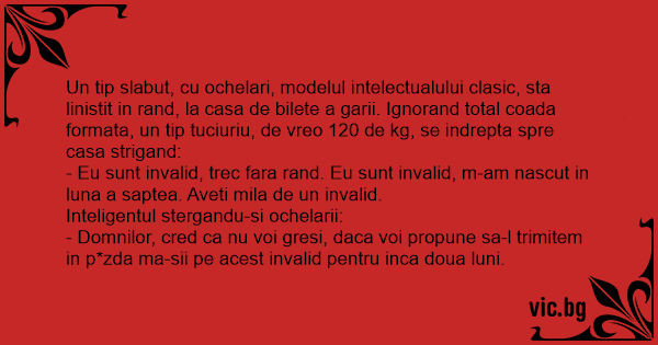 Un tip slabut, cu ochelari, modelul intelectualului clasic, sta linistit in rand, la casa de bilete a garii. Ignorand total coada formata, un tip tuciuriu, de vreo 120 de kg, se indrepta spre casa strigand: