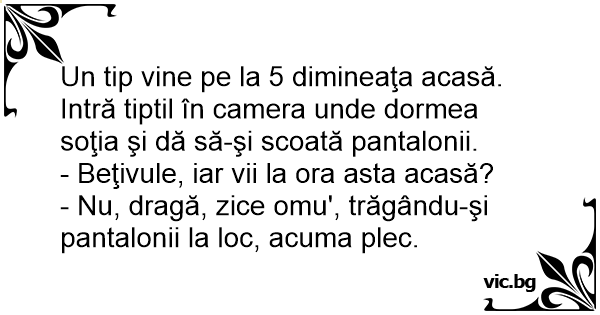 Un tip vine pe la 5 dimineaţa acasă. Intră tiptil în camera unde dormea soţia şi dă să-şi scoată pantalonii.