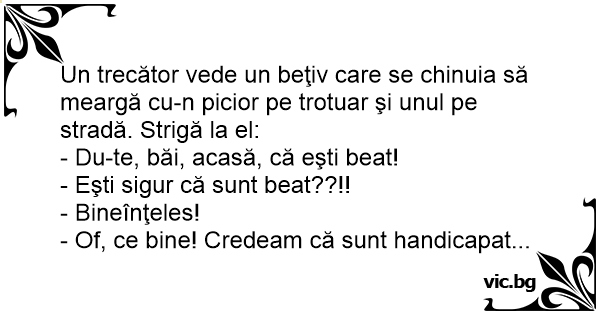 Un trecător vede un beţiv care se chinuia să meargă cu-n picior pe trotuar şi unul pe stradă. Strigă la el: