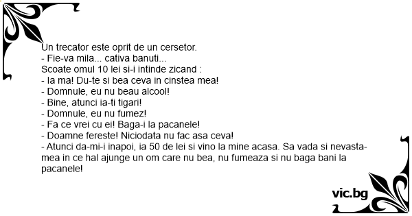 - Atunci da-mi-i inapoi, ia 50 de lei si vino la mine acasa. Sa vada si nevasta-mea in ce hal ajunge un om care nu bea, nu fumeaza si nu baga bani la pacanele!