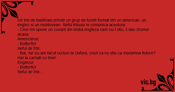 Un trib de bastinasi prinde un grup de turisti format din un american, un englez si un moldovean. Seful tribului le comunica acestora:
