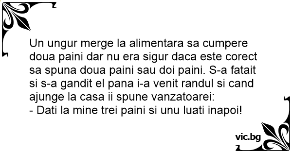 Un ungur merge la alimentara sa cumpere doua paini dar nu era sigur daca este corect sa spuna doua paini sau doi paini. S-a fatait si s-a gandit el pana i-a venit randul si cand ajunge la casa ii spune vanzatoarei: