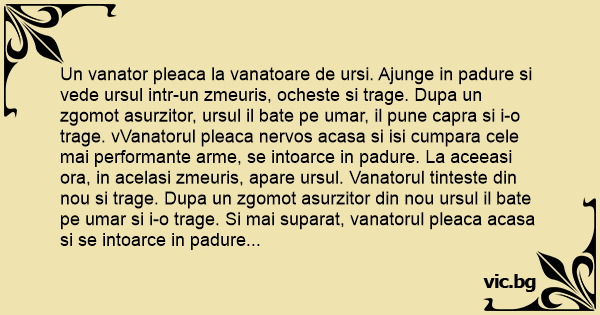Un vanator pleaca la vanatoare de ursi. Ajunge in padure si vede ursul intr-un zmeuris, ocheste si trage. Dupa un zgomot asurzitor, ursul il bate pe umar, il pune capra si i-o trage. vVanatorul pleaca nervos acasa si isi cumpara cele mai performante arme, se intoarce in padure. La aceeasi ora, in acelasi zmeuris, apare ursul. Vanatorul tinteste din nou si trage. Dupa un zgomot asurzitor din nou ursul il bate pe umar si i-o trage. Si mai suparat, vanatorul pleaca acasa si se intoarce in padure cu un tanc. La acceasi ora, in acelasi zmeuris, apare ursul, vanatorul tinteste din nou si dupa un zgomot asurzitor ursul il bate din nou pe umar si ii spune: