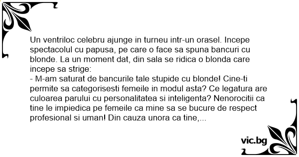 Un ventriloc celebru ajunge in turneu intr-un orasel. Incepe spectacolul cu papusa, pe care o face sa spuna bancuri cu blonde. La un moment dat, din sala se ridica o blonda care incepe sa strige: