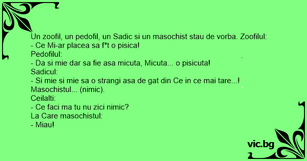 Un zoofil, un pedofil, un Sadic si un маsосhisт stau de vorba. Zoofilul:
