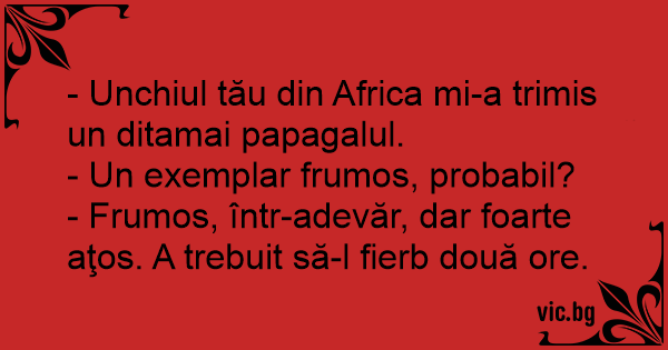 - Unchiul tău din Africa mi-a trimis un ditamai papagalul.