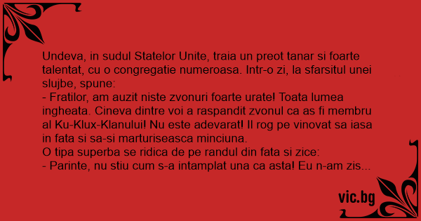 Undeva, in sudul Statelor Unite, traia un preot tanar si foarte talentat, cu o congregatie numeroasa. Intr-o zi, la sfarsitul unei slujbe, spune: