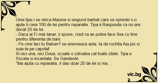 Unei tipe i se strica Masina si singurul barbat care se opreste s-o ajute Ii cere 100 de lei pentru reparatie. Tipa ii Raspunde ca nu are decat 20 de lei.