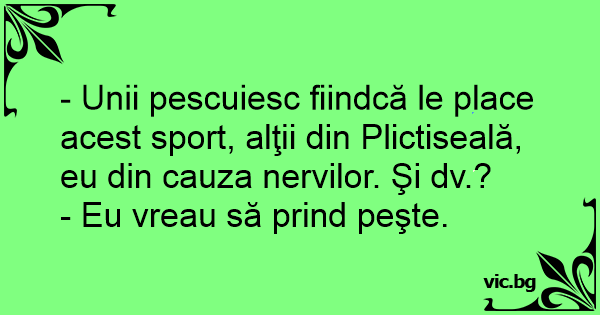 - Unii pescuiesc fiindcă le place acest sport, alţii din Plictiseală, eu din cauza nervilor. Şi dv.?