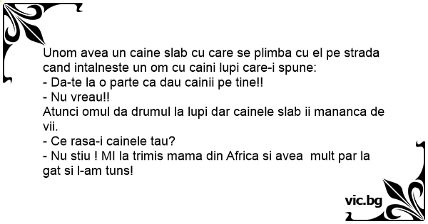 Unom avea un caine slab cu care se plimba cu el pe strada cand intalneste un om cu caini lupi care-i spune: