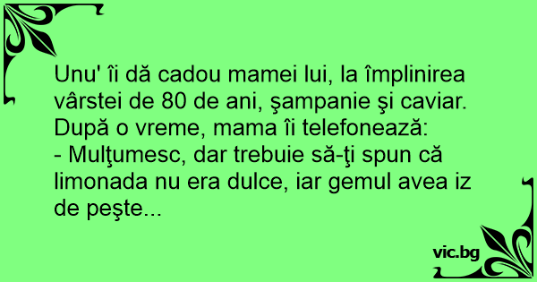 Unu' îi dă cadou mamei lui, la împlinirea vârstei de 80 de ani, şampanie şi caviar.