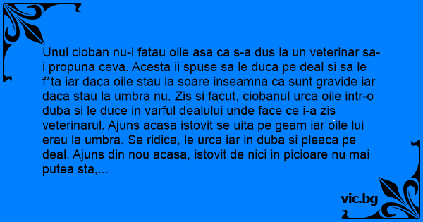 Unui cioban nu-i fatau oile asa ca s-a dus la un veterinar sa-i propuna ceva. Acesta ii spuse sa le duca pe deal si sa le f*ta iar daca oile stau la soare inseamna ca sunt gravide iar daca stau la umbra nu. Zis si facut, ciobanul urca oile intr-o duba si le duce in varful dealului unde face ce i-a zis veterinarul. Ajuns acasa istovit se uita pe geam iar oile lui erau la umbra. Se ridica, le urca iar in duba si pleaca pe deal. Ajuns din nou acasa, istovit de nici in picioare nu mai putea sta, o roaga pe sotia sa sa se uite ce fac oile. Aceasta ii spune: