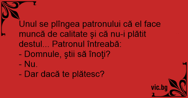 Unul se plîngea patronului că el face muncă de calitate şi că nu-i plătit destul... Patronul întreabă: