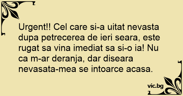 Urgent!! Cel care si-a uitat nevasta dupa petrecerea de ieri seara, este rugat sa vina imediat sa si-o ia! Nu ca m-ar deranja, dar diseara nevasata-mea se intoarce acasa.