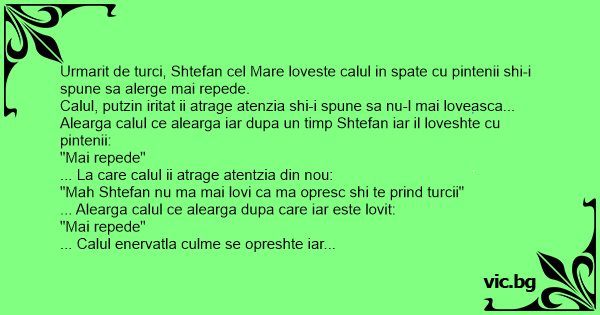Calul, putzin iritat ii atrage atenzia shi-i spune sa nu-l mai loveasca... Alearga calul ce alearga iar dupa un timp Shtefan iar il loveshte cu pintenii: