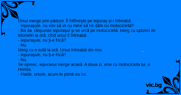 - Ba da, răspunde iepuraşul şi se urcă pe motocicletă. Merg cu optzeci de kilometri la oră, cînd ursul îl întreabă: