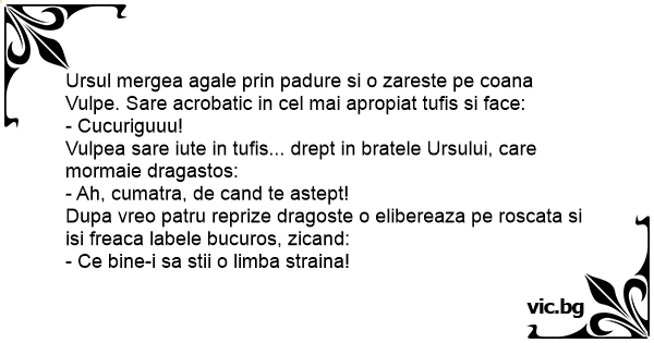 Ursul mergea agale prin padure si o zareste pe coana Vulpe. Sare acrobatic in cel mai apropiat tufis si face: