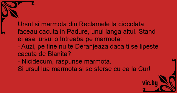 Ursul si marmota din Reclamele la ciocolata faceau cacuta in Padure, unul langa altul. Stand ei asa, ursul o Intreaba pe marmota: