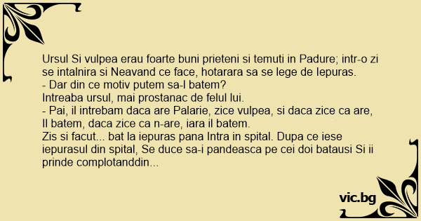 - Pai, il intrebam daca are Palarie, zice vulpea, si daca zice ca are, Il batem, daca zice ca n-are, iara il batem.