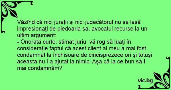 - Onorată curte, stimat juriu, vă rog să luaţi în consideraţie faptul că acest client al meu a mai fost condamnat la închisoare de cincisprezece ori şi totuşi aceasta nu l-a ajutat la nimic. Aşa că la ce bun să-l mai condamnăm?