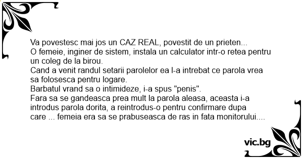 Fara sa se gandeasca prea mult la parola aleasa, aceasta i-a introdus parola dorita, a reintrodus-o pentru confirmare dupa care ... femeia era sa se prabuseasca de ras in fata monitorului.