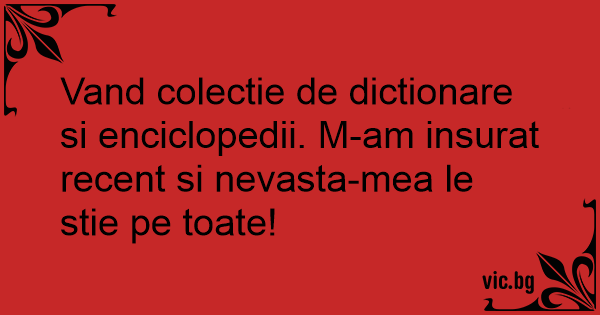 Vand colectie de dictionare si enciclopedii. M-am insurat recent si nevasta-mea le stie pe toate!