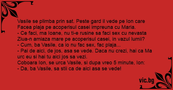 - Ce faci, ma Ioane, nu ti-e rusine sa faci sеx cu nevasta Ziua-n amiaza mare pe acoperisul casei, in vazul lumii?