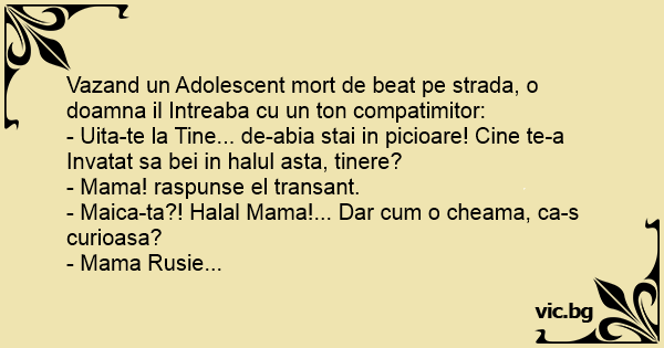 Vazand un Adolescent mort de beat pe strada, o doamna il Intreaba cu un ton compatimitor: