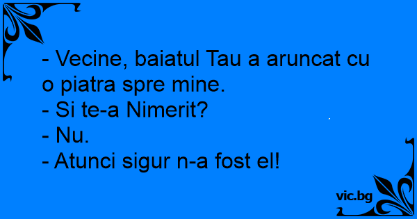 - Vecine, baiatul Tau a aruncat cu o piatra spre mine.<br />- Si te-a Nimerit?<br />- Nu.<br />- Atunci sigur n-a fost el!