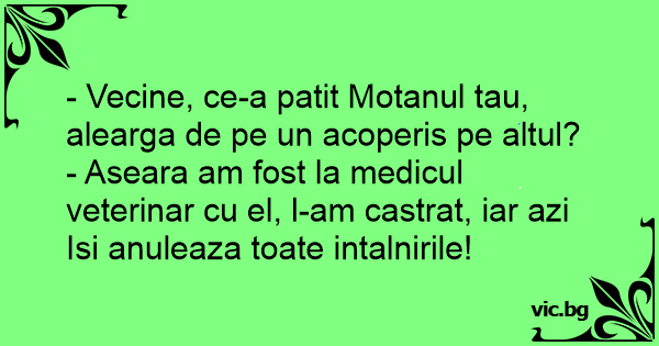 - Vecine, ce-a patit Motanul tau, alearga de pe un acoperis pe altul?
