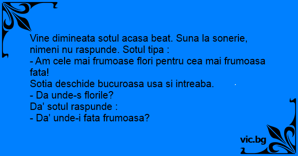 Vine dimineata sotul acasa beat. Suna la sonerie, nimeni nu raspunde. Sotul tipa :