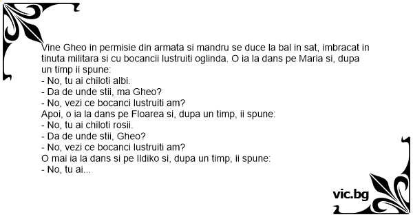 Vine Gheo in permisie din armata si mandru se duce la bal in sat, imbracat in tinuta militara si cu bocancii lustruiti oglinda. O ia la dans pe Maria si, dupa un timp ii spune: