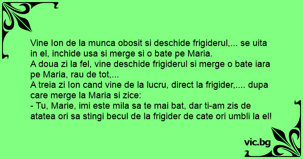 - Tu, Marie, imi este mila sa te mai bat, dar ti-am zis de atatea ori sa stingi becul de la frigider de cate ori umbli la el!