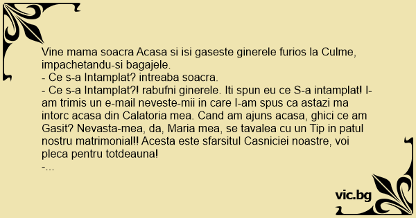 - Calmeaza-te, ii zice soacra-sa. Ceva nu e in Regula in toata povestea asta. Maria nu ar face Niciodata asa ceva! Stai numai o clipa, sa ma Duc sa verific ce s-a intamplat...