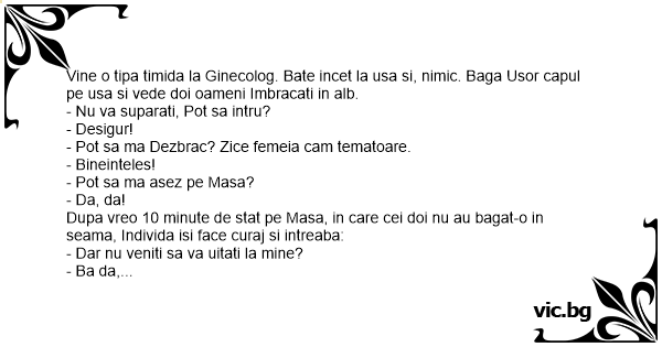 Vine o tipa timida la Ginecolog. Bate incet la usa si, nimic. Baga Usor capul pe usa si vede doi oameni Imbracati in alb.