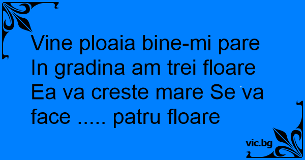 Vine ploaia bine-mi pare In gradina am trei floare Ea va creste mare Se va face ..... patru floare