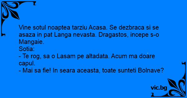 Vine sotul noaptea tarziu Acasa. Se dezbraca si se asaza in pat Langa nevasta. Dragastos, incepe s-o Mangaie.