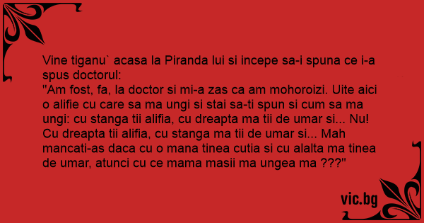 "Am fost, fa, la doctor si mi-a zas ca am mohoroizi. Uite aici o alifie cu care sa ma ungi si stai sa-ti spun si сuм sa ma ungi: cu stanga tii alifia, cu dreapta ma tii de umar si... Nu! Cu dreapta tii alifia, cu stanga ma tii de umar si... Mah mancati-as daca cu o mana tinea cutia si cu alalta ma tinea de umar, atunci cu ce mama masii ma ungea ma ???"