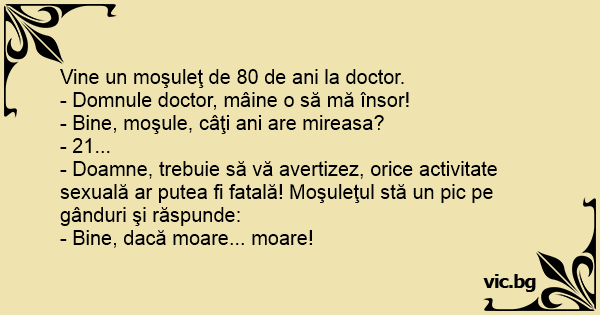 - Doamne, trebuie să vă avertizez, orice activitate sexuală ar putea fi fatală! Moşuleţul stă un pic pe gânduri şi răspunde: