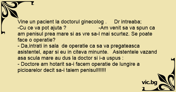 Vine un pacient la doctorul ginecolog . Dr intreaba; -Cu ce va рот ajuta ? -Am venit sa va spun ca am penisul prea mare si as vre sa-l mai scurtez. Se poate face o operatie?
