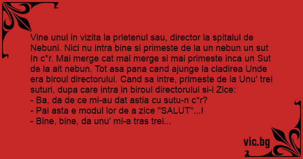 Vine unul in vizita la prietenul sau, director la spitalul de Nebuni. Nici nu intra bine si primeste de la un nebun un sut In c*r. Mai merge cat mai merge si mai primeste inca un Sut de la alt nebun. Tot asa pana cand ajunge la cladirea Unde era biroul directorului. Cand sa intre, primeste de la Unu' trei suturi, dupa care intra in biroul directorului si-i Zice: