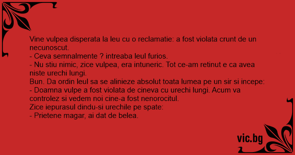 Vine vulpea disperata la leu cu o reclamatie: a fost violata crunt de un necunoscut. - Ceva semnalmente ? intreaba leul furios. - Nu stiu nimic, zice vulpea, era intuneric. Tot ce-am retinut e ca avea niste urechi lungi. Bun. Da ordin leul sa se alinieze absolut toata lumea pe un sir si incepe: - Doamna vulpe a fost violata de cineva cu urechi lungi. Acum va controlez si vedem noi cine-a fost nenorocitul. Zice iepurasul dindu-si urechile pe spate: - Prietene magar, ai dat de belea.