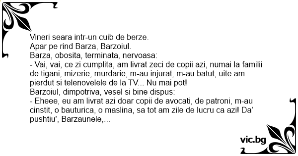 - Eheee, eu am livrat azi doar copii de avocati, de patroni, m-au cinstit, o bauturica, o maslina, sa tot am zile de lucru ca azi! Da' pushtiu', Barzaunele, unde umbla?