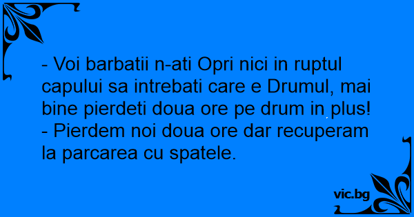- Voi barbatii n-ati Opri nici in ruptul capului sa intrebati care e Drumul, mai bine pierdeti doua ore pe drum in plus!