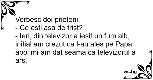 Vorbesc doi prieteni:<br />- Ce еsтi asa de trist?<br />- Ieri, din televizor a iesit un fum alb, initial am crezut ca l-au ales pe Papa, apoi mi-am dat seama ca televizorul a ars.