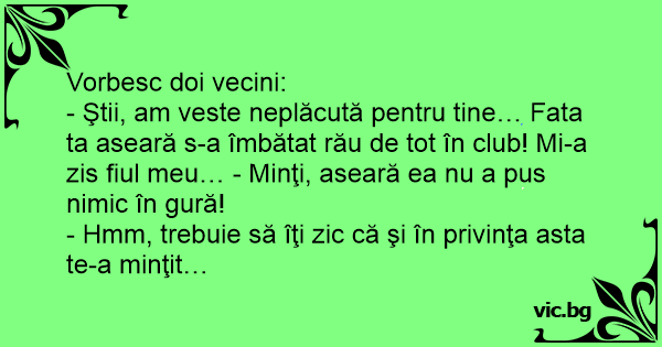 - Ştii, am veste neplăcută pentru tine… Fata ta aseară s-a îmbătat rău de tot în club! Mi-a zis fiul meu… - Minţi, aseară ea nu a pus nimic în gură!