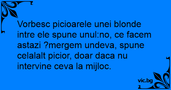 Vorbesc picioarele unei blonde intre ele spune unul:no, ce facem astazi ?mergem undeva, spune celalalt picior, doar daca nu intervine ceva la mijloc.
